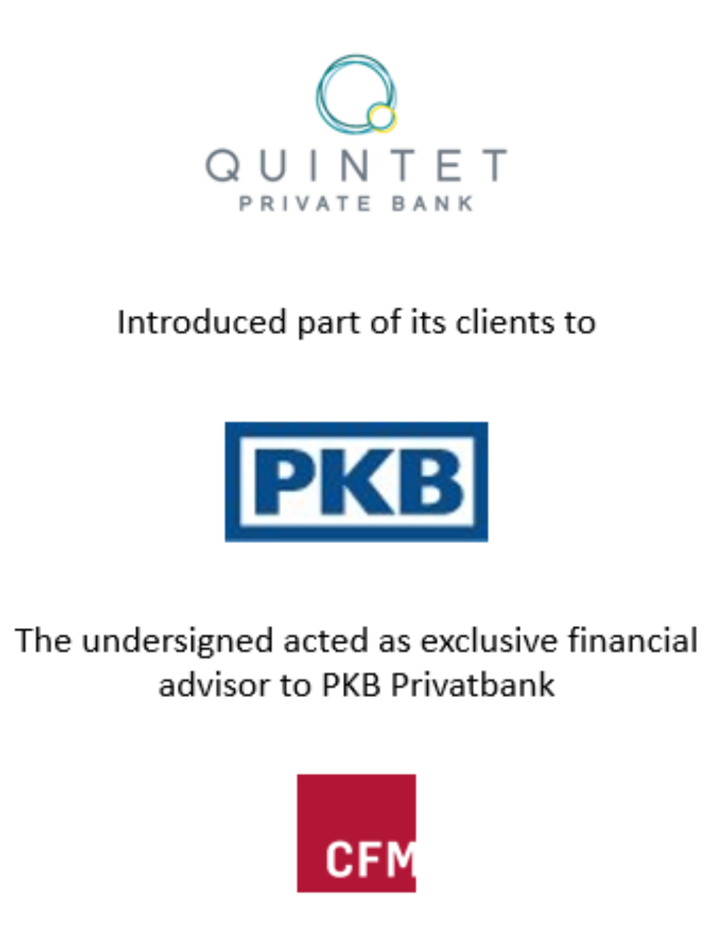 - CFM partners acted as exclusive financial advisor to PKB, leveraging on its unique positioning and expertise in the Swiss financial services market. CFM partners is a leading Swiss M&A and corporate finance advisory firm specialised on the financial services industry.