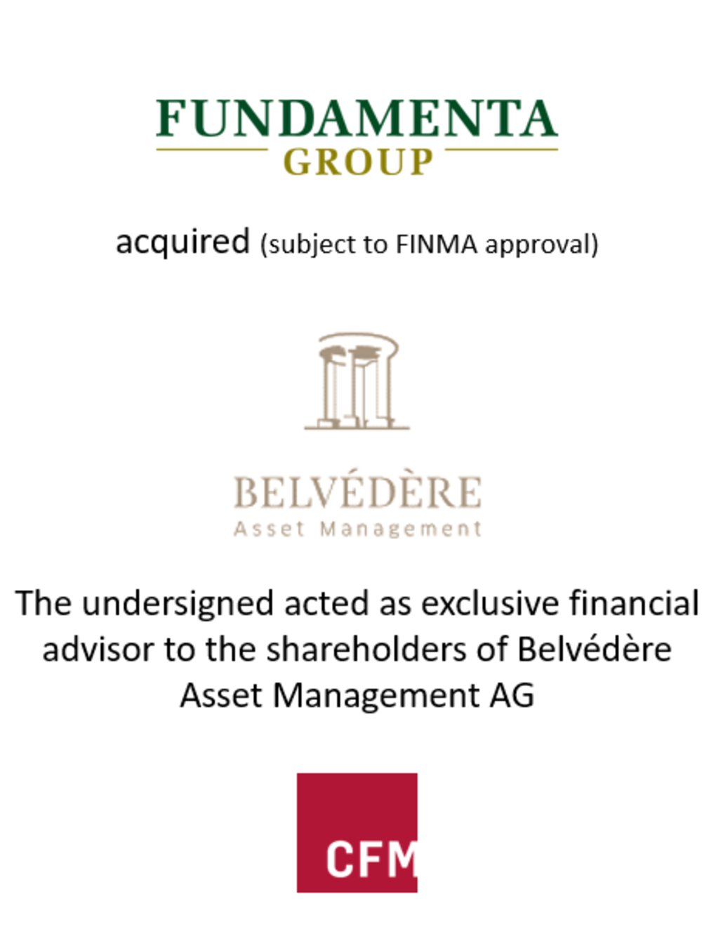 - CFM partners ag acted as exclusive financial advisor to the shareholders of Belvédère Asset Management AG (“Belvédère”) in the sale of 100% of its shares to Fundamenta Group (“Fundamenta”). In return, the current shareholders of Belvédère will acquire a stake in Fundamenta. The transaction is subject to approval by FINMA.